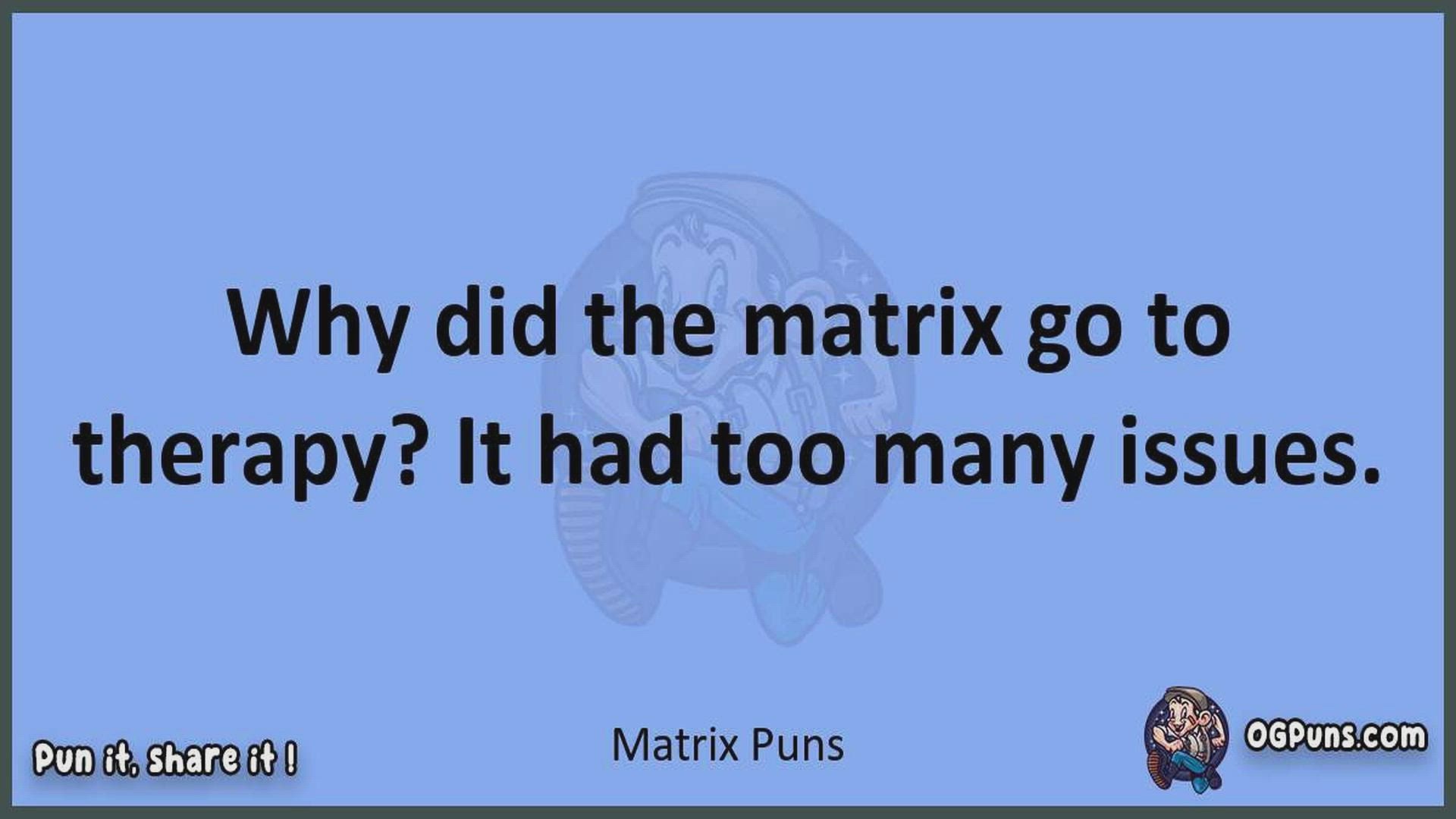Delve into the delightful world of Matrix Puns ! Here, you'll find an entertaining mix of jokes, puns, quips, and wordplay. Each piece is crafted to offer a quick escape into humor, perfect for a light-hearted moment in any day. Whether you're seeking a chuckle or a clever twist on familiar themes, this collection promises to deliver smiles and laughter. Embrace the lighter side of life with humor that's both witty and refreshing."