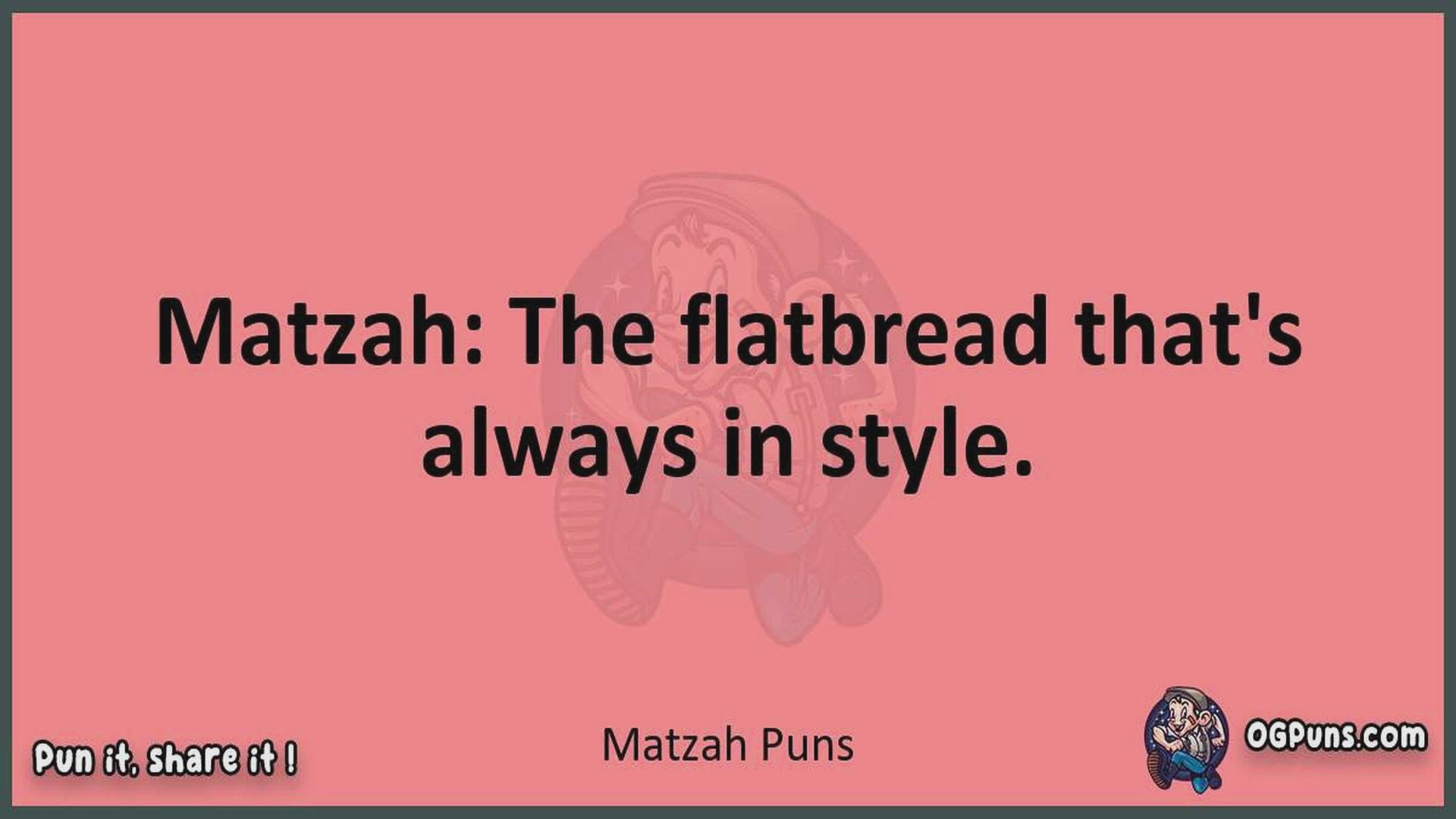 Delve into the delightful world of Matzah Puns ! Here, you'll find an entertaining mix of jokes, puns, quips, and wordplay. Each piece is crafted to offer a quick escape into humor, perfect for a light-hearted moment in any day. Whether you're seeking a chuckle or a clever twist on familiar themes, this collection promises to deliver smiles and laughter. Embrace the lighter side of life with humor that's both witty and refreshing."