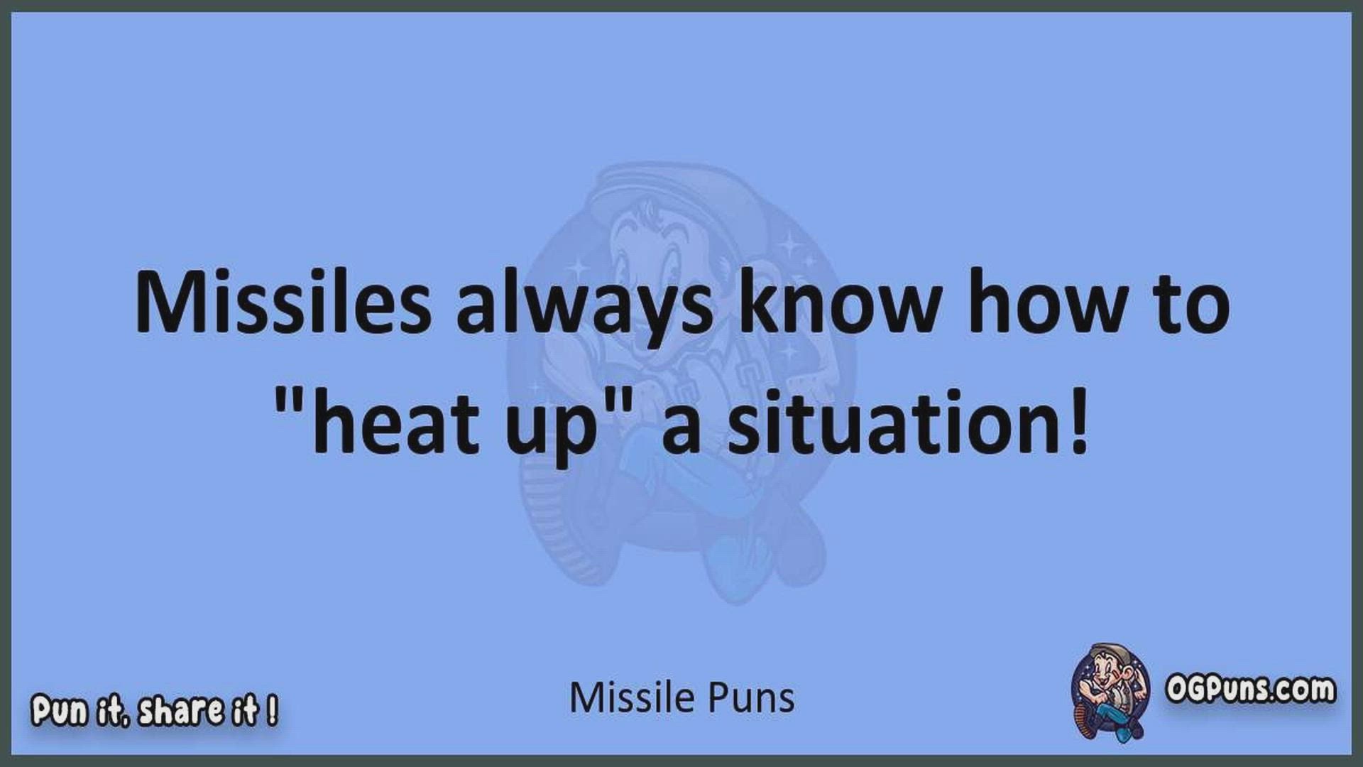 Delve into the delightful world of Missile Puns ! Here, you'll find an entertaining mix of jokes, puns, quips, and wordplay. Each piece is crafted to offer a quick escape into humor, perfect for a light-hearted moment in any day. Whether you're seeking a chuckle or a clever twist on familiar themes, this collection promises to deliver smiles and laughter. Embrace the lighter side of life with humor that's both witty and refreshing."