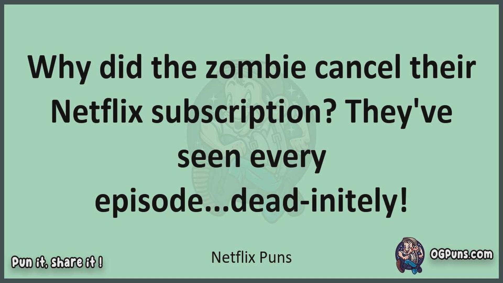 Delve into the delightful world of Netflix Puns ! Here, you'll find an entertaining mix of jokes, puns, quips, and wordplay. Each piece is crafted to offer a quick escape into humor, perfect for a light-hearted moment in any day. Whether you're seeking a chuckle or a clever twist on familiar themes, this collection promises to deliver smiles and laughter. Embrace the lighter side of life with humor that's both witty and refreshing."