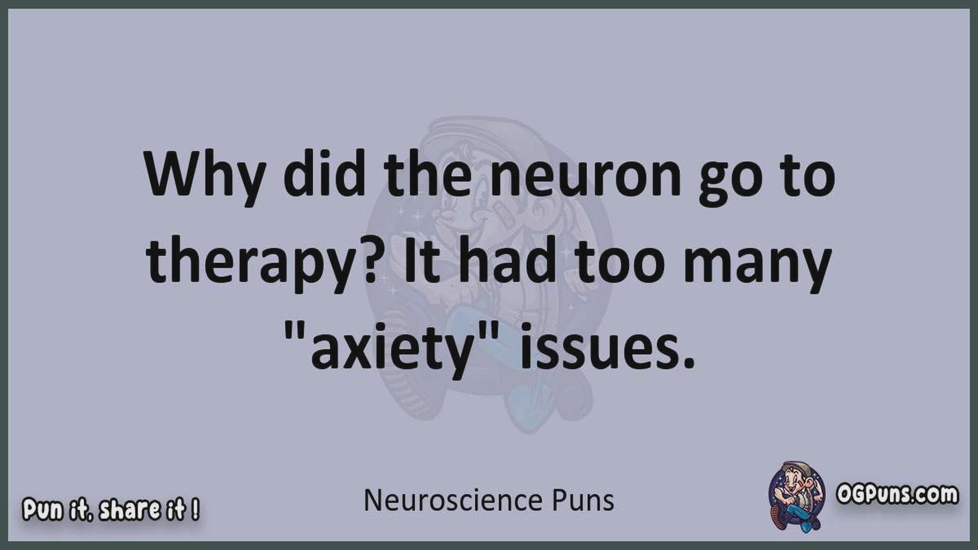 Delve into the delightful world of Neuroscience Puns ! Here, you'll find an entertaining mix of jokes, puns, quips, and wordplay. Each piece is crafted to offer a quick escape into humor, perfect for a light-hearted moment in any day. Whether you're seeking a chuckle or a clever twist on familiar themes, this collection promises to deliver smiles and laughter. Embrace the lighter side of life with humor that's both witty and refreshing."