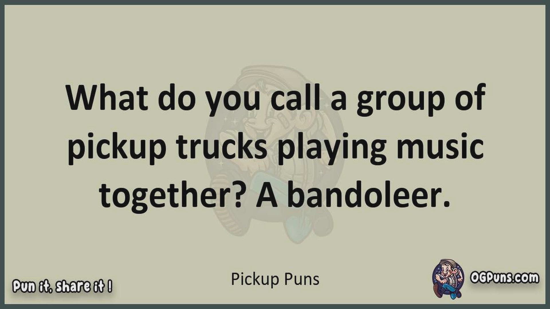 Delve into the delightful world of Pickup Puns ! Here, you'll find an entertaining mix of jokes, puns, quips, and wordplay. Each piece is crafted to offer a quick escape into humor, perfect for a light-hearted moment in any day. Whether you're seeking a chuckle or a clever twist on familiar themes, this collection promises to deliver smiles and laughter. Embrace the lighter side of life with humor that's both witty and refreshing."