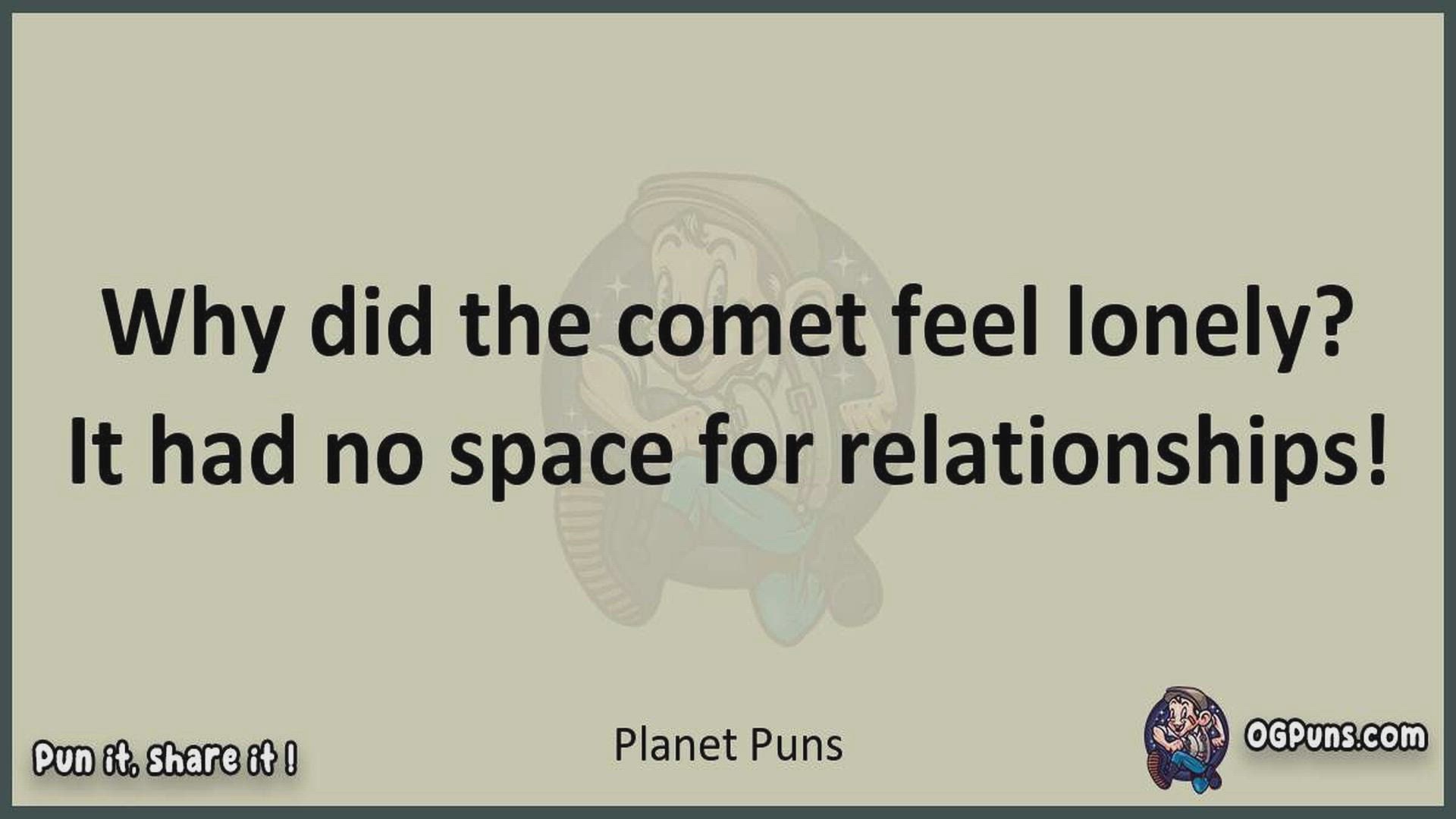 Delve into the delightful world of Planet Puns ! Here, you'll find an entertaining mix of jokes, puns, quips, and wordplay. Each piece is crafted to offer a quick escape into humor, perfect for a light-hearted moment in any day. Whether you're seeking a chuckle or a clever twist on familiar themes, this collection promises to deliver smiles and laughter. Embrace the lighter side of life with humor that's both witty and refreshing."