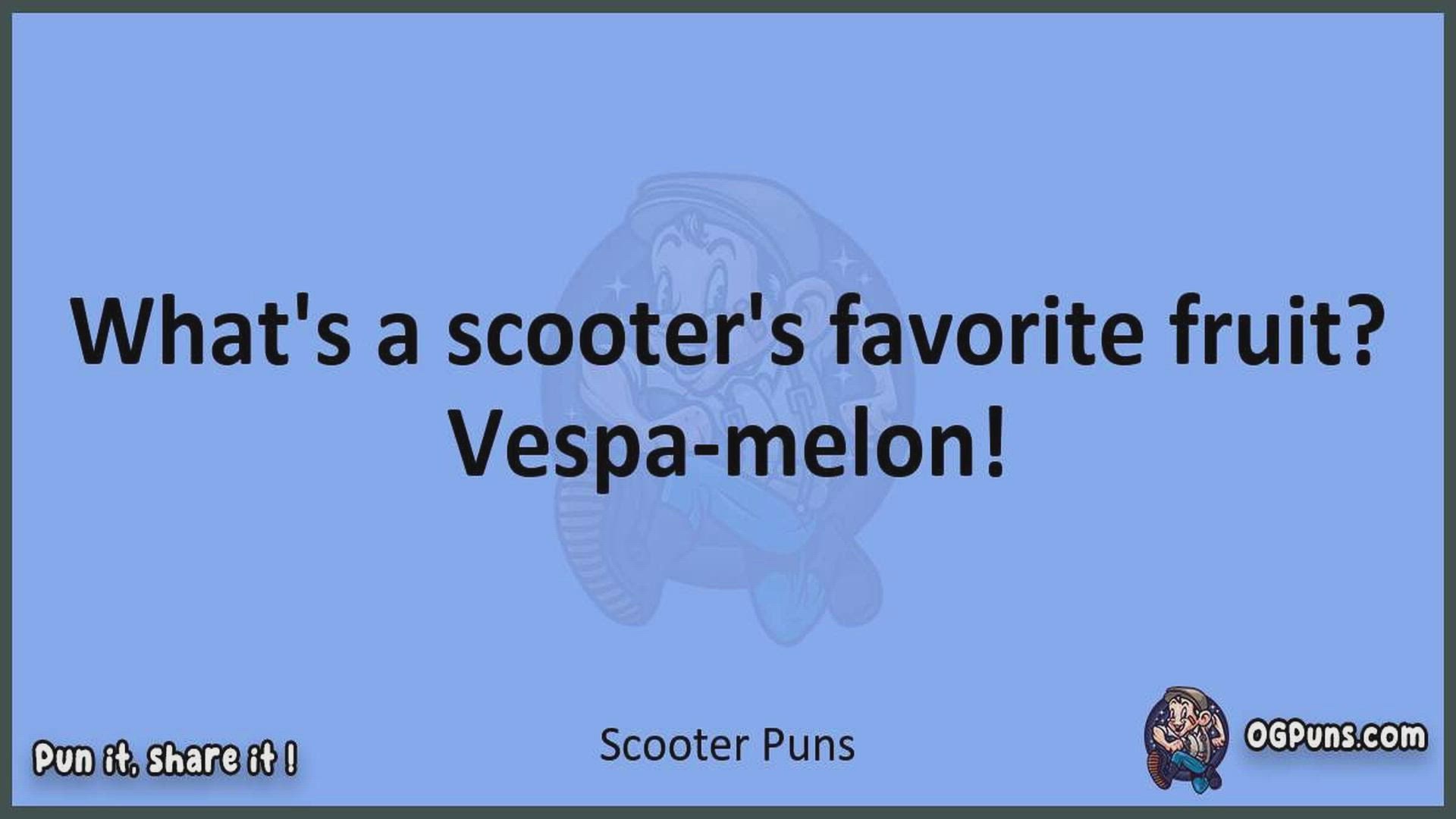 Delve into the delightful world of Scooter Puns ! Here, you'll find an entertaining mix of jokes, puns, quips, and wordplay. Each piece is crafted to offer a quick escape into humor, perfect for a light-hearted moment in any day. Whether you're seeking a chuckle or a clever twist on familiar themes, this collection promises to deliver smiles and laughter. Embrace the lighter side of life with humor that's both witty and refreshing."