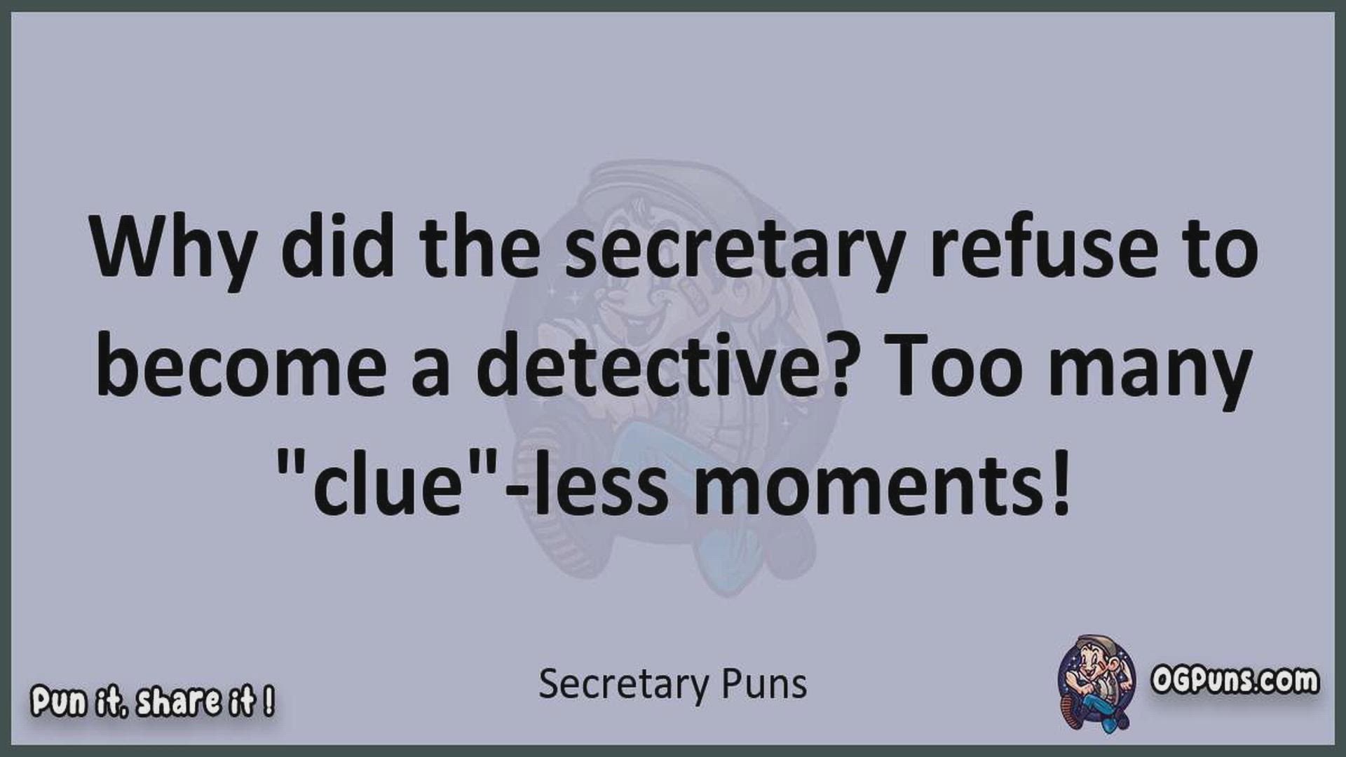 Delve into the delightful world of Secretary Puns ! Here, you'll find an entertaining mix of jokes, puns, quips, and wordplay. Each piece is crafted to offer a quick escape into humor, perfect for a light-hearted moment in any day. Whether you're seeking a chuckle or a clever twist on familiar themes, this collection promises to deliver smiles and laughter. Embrace the lighter side of life with humor that's both witty and refreshing."