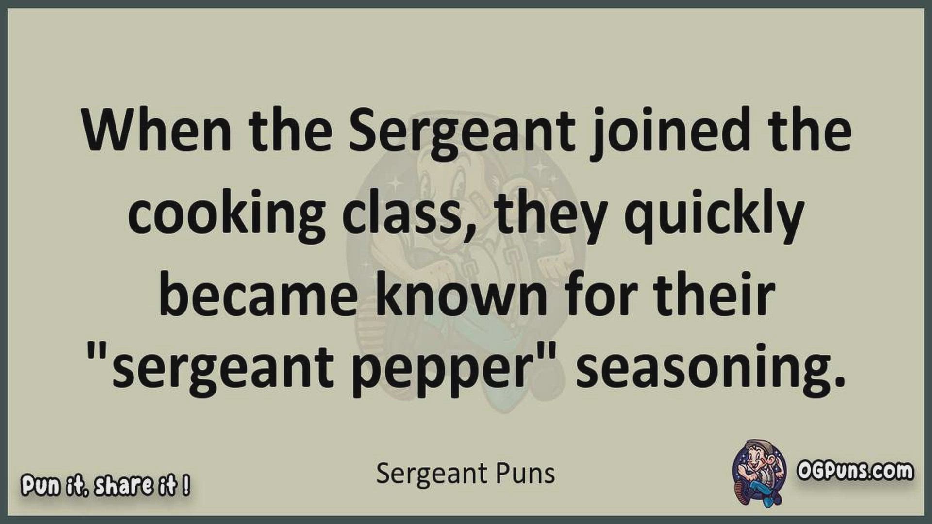 Delve into the delightful world of Sergeant Puns ! Here, you'll find an entertaining mix of jokes, puns, quips, and wordplay. Each piece is crafted to offer a quick escape into humor, perfect for a light-hearted moment in any day. Whether you're seeking a chuckle or a clever twist on familiar themes, this collection promises to deliver smiles and laughter. Embrace the lighter side of life with humor that's both witty and refreshing."