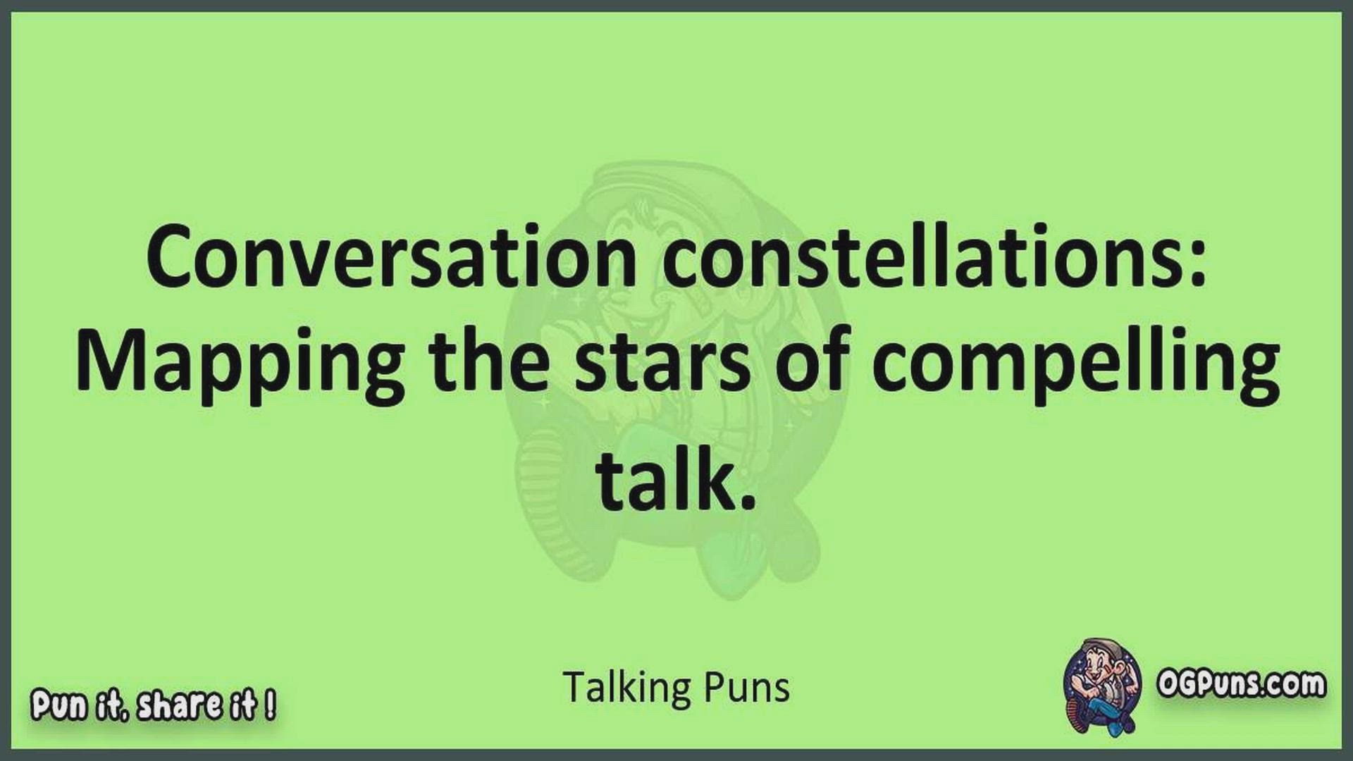 Delve into the delightful world of Talking Puns ! Here, you'll find an entertaining mix of jokes, puns, quips, and wordplay. Each piece is crafted to offer a quick escape into humor, perfect for a light-hearted moment in any day. Whether you're seeking a chuckle or a clever twist on familiar themes, this collection promises to deliver smiles and laughter. Embrace the lighter side of life with humor that's both witty and refreshing."