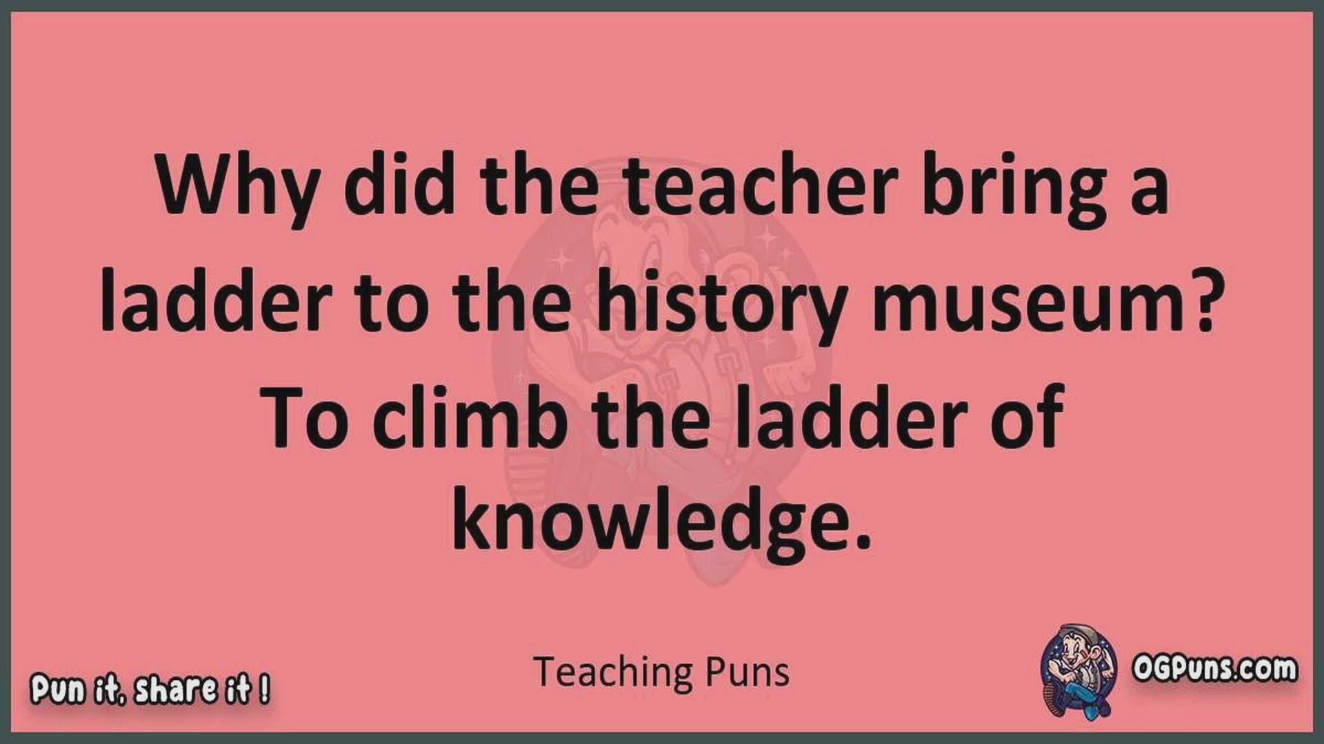 Delve into the delightful world of Teaching Puns ! Here, you'll find an entertaining mix of jokes, puns, quips, and wordplay. Each piece is crafted to offer a quick escape into humor, perfect for a light-hearted moment in any day. Whether you're seeking a chuckle or a clever twist on familiar themes, this collection promises to deliver smiles and laughter. Embrace the lighter side of life with humor that's both witty and refreshing."