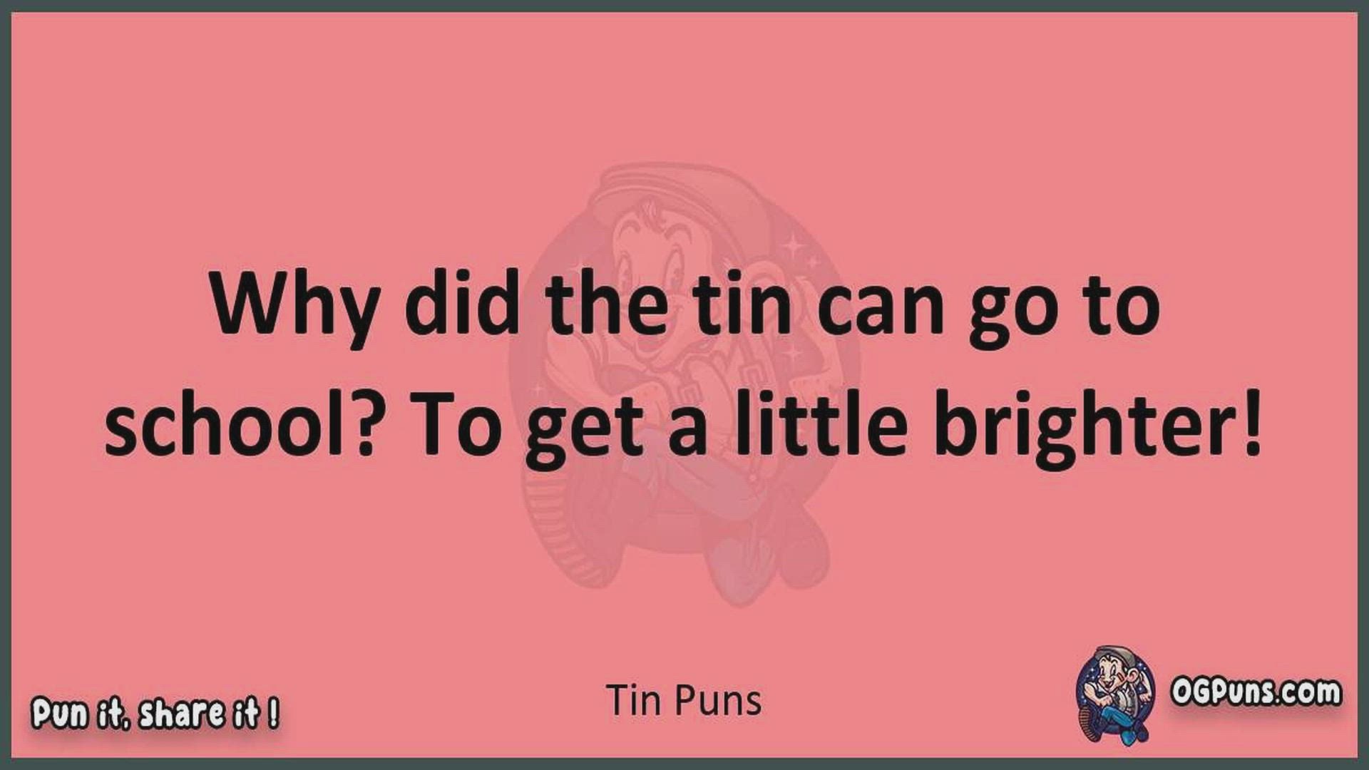 Delve into the delightful world of Tin Puns ! Here, you'll find an entertaining mix of jokes, puns, quips, and wordplay. Each piece is crafted to offer a quick escape into humor, perfect for a light-hearted moment in any day. Whether you're seeking a chuckle or a clever twist on familiar themes, this collection promises to deliver smiles and laughter. Embrace the lighter side of life with humor that's both witty and refreshing."