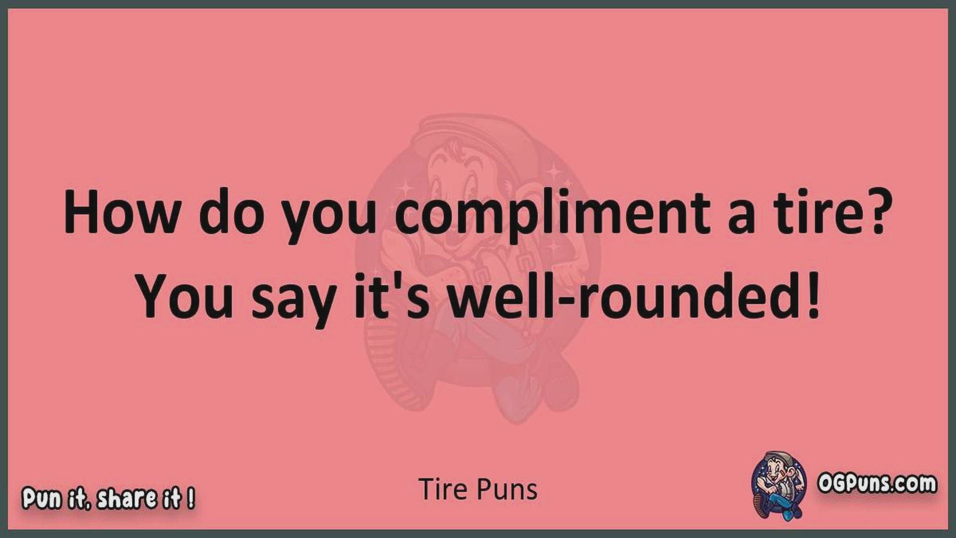 Delve into the delightful world of Tire Puns ! Here, you'll find an entertaining mix of jokes, puns, quips, and wordplay. Each piece is crafted to offer a quick escape into humor, perfect for a light-hearted moment in any day. Whether you're seeking a chuckle or a clever twist on familiar themes, this collection promises to deliver smiles and laughter. Embrace the lighter side of life with humor that's both witty and refreshing."