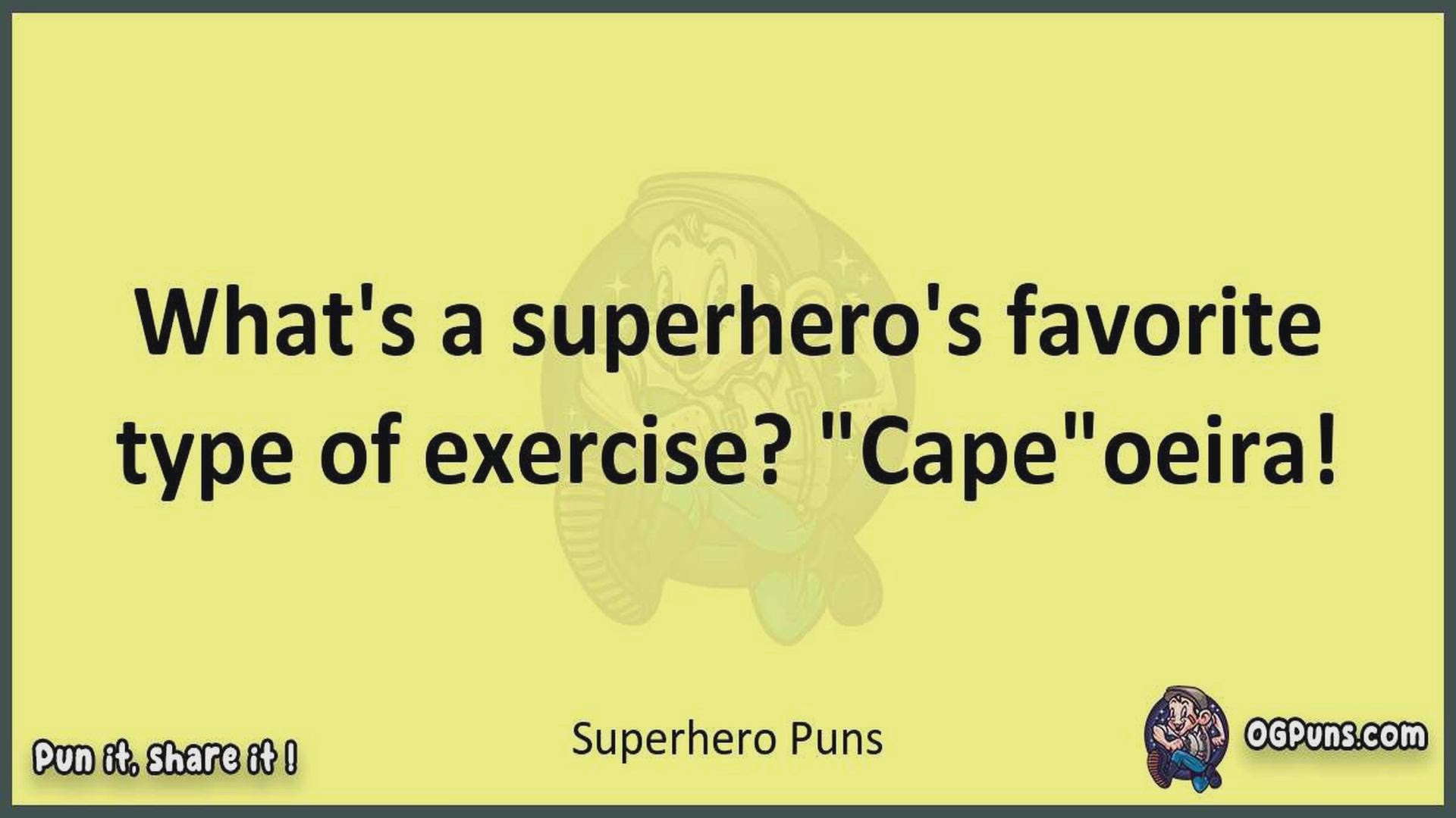 Delve into the delightful world of Superhero Puns ! Here, you'll find an entertaining mix of jokes, puns, quips, and wordplay. Each piece is crafted to offer a quick escape into humor, perfect for a light-hearted moment in any day. Whether you're seeking a chuckle or a clever twist on familiar themes, this collection promises to deliver smiles and laughter. Embrace the lighter side of life with humor that's both witty and refreshing."