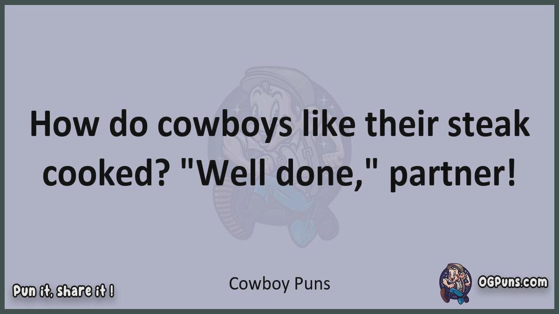Delve into the delightful world of Cowboy Puns ! Here, you'll find an entertaining mix of jokes, puns, quips, and wordplay. Each piece is crafted to offer a quick escape into humor, perfect for a light-hearted moment in any day. Whether you're seeking a chuckle or a clever twist on familiar themes, this collection promises to deliver smiles and laughter. Embrace the lighter side of life with humor that's both witty and refreshing."