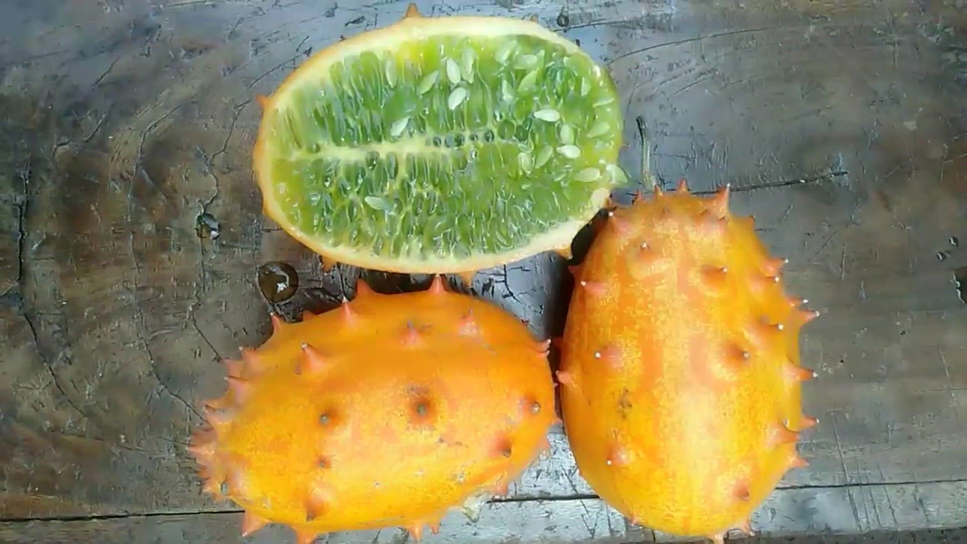 A bright orange kiwano fruit with lime green flesh