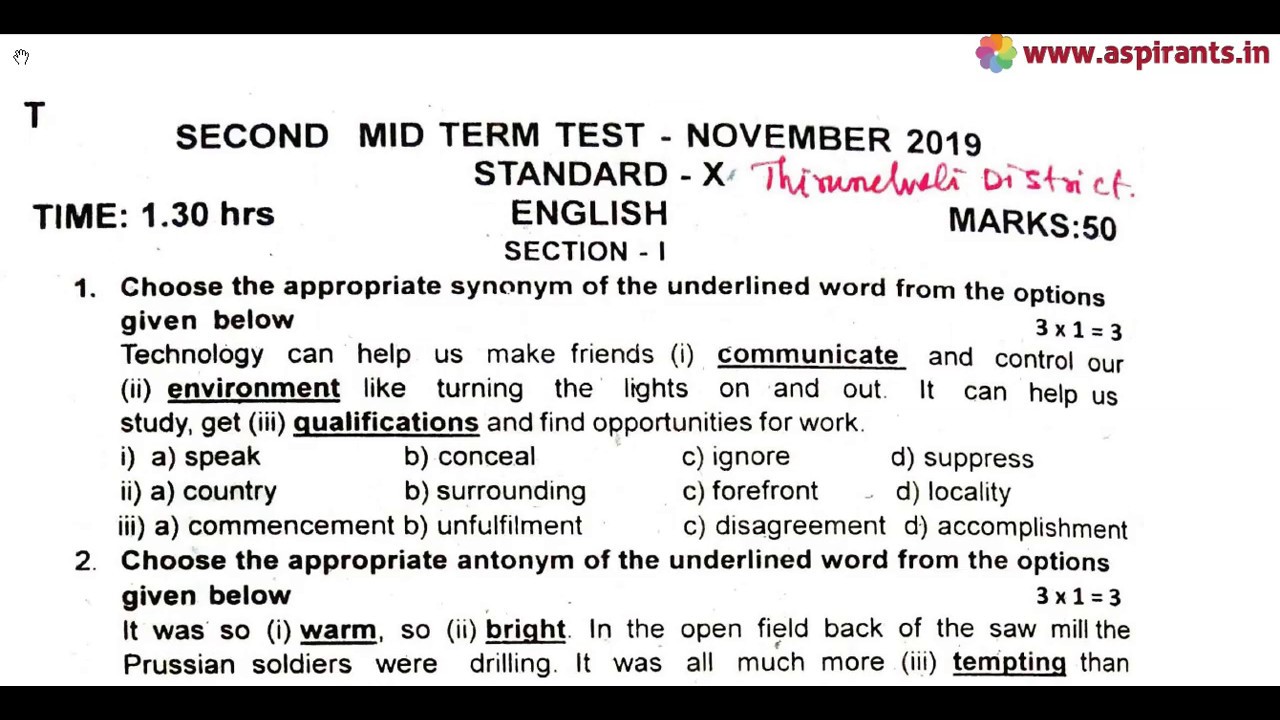10th English 2nd MidTerm Question Paper 2019-20 | Tirunelveli District | Team Aspirants