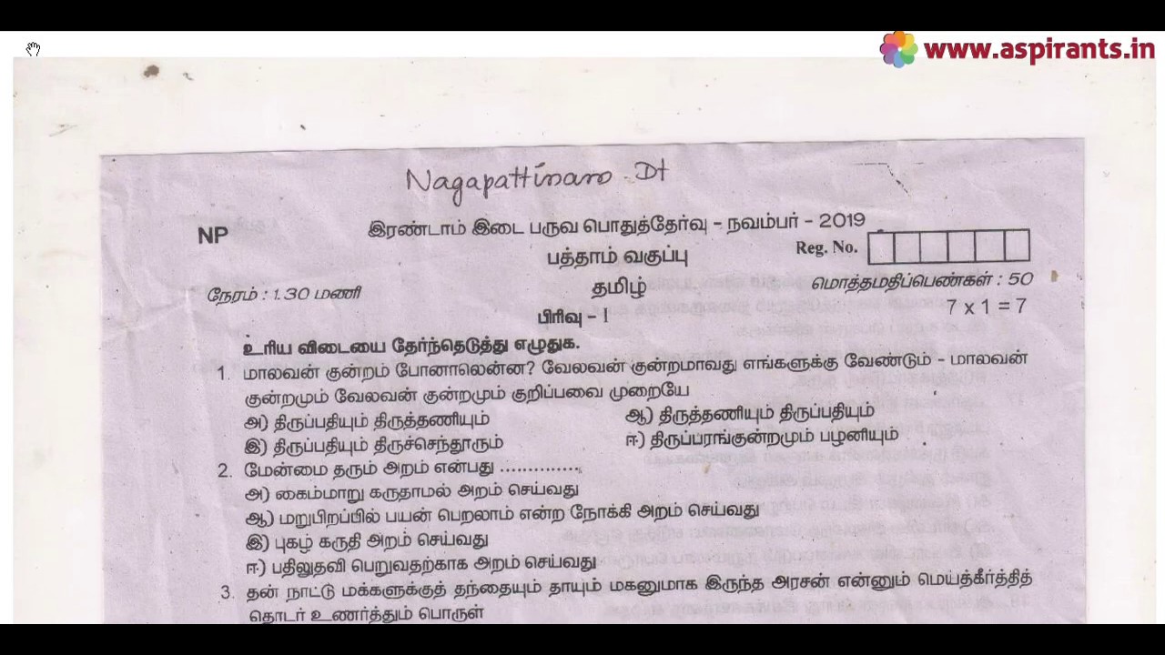 10th Tamil 2nd MidTerm Question Paper 2019-20 | Nagai District | Team Aspirants