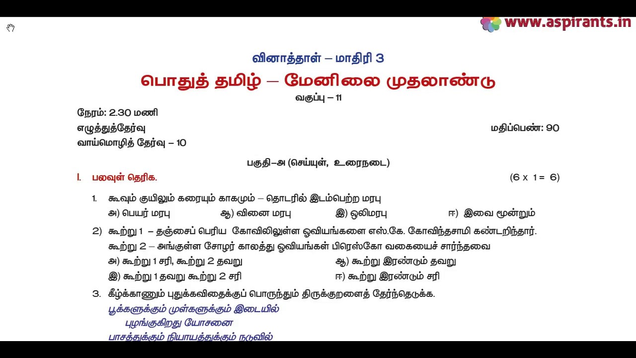 11th Tamil Model Question Paper 2018-19 | Model Paper 3 | Team Aspirants