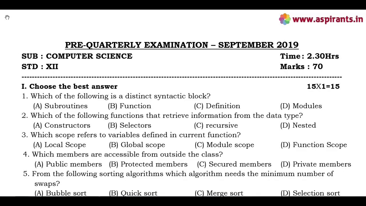 Team Aspirants Provides a clear and special Guidance for all 12th Students. Aspirants Team Provides 12th Standard Computer Science Quarterly Exam 2019-20 Model Question Papers and Answer Keys ( Previous year Question Papers). Tamilnadu Government Department of School Education conducts Quarterly Common Examinations every year at the end of first term - (September). Now the quarterly Examinations are conducted on the content of Samacheer Kalvi Text Books throughout Tamilnadu. These Exams will be conducted common, that means all the state board schools should follow the same question papers especially 12th Standard. This time our team has taken a keen effort to provide more study materials in order to help the Students. So we have covered the maximum and we are sure that we will instantly update more study materials for 12th Standard Exams. These Answer Keys are prepared by well-versed subject teachers. So that the students and teachers can analyse the best one for their evaluation.