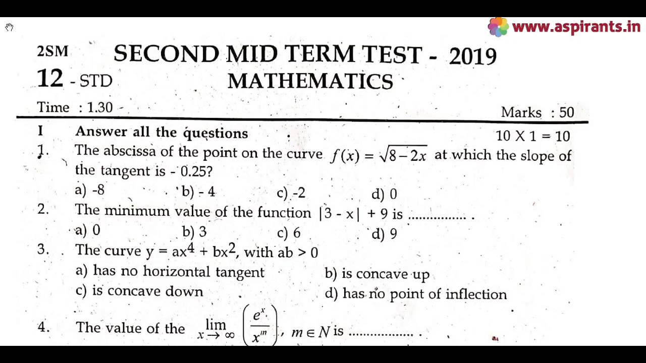 Team Aspirants Provides a clear and special Guidance for all 12th Students. Aspirants Team Provides 12th Maths 2nd Mid Term 2019-20 Question Papers and Answer Keys ( Previous year Question Papers). Now the 2nd Mid Term Examinations are conducted on the content of Samacheer Kalvi Text Books throughout Tamilnadu. This time our team has taken a keen effort to provide more study materials in order to help the Students. So we have covered the maximum and we are sure that we will instantly update more study materials for 12th Standard Exams. These Answer Keys are prepared by well-versed subject teachers. So that the students and teachers can analyse the best one for their evaluation.