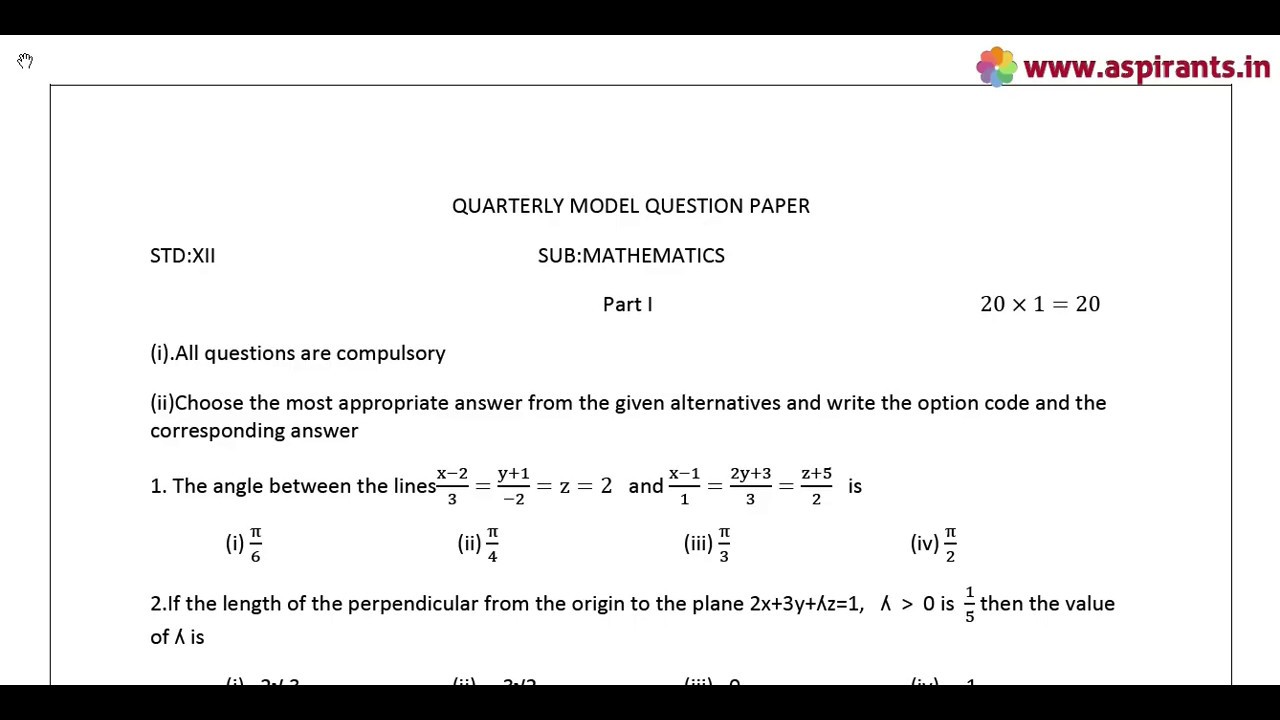 Team Aspirants Provides a clear and special Guidance for all 12th Students. Aspirants Team Provides 12th Standard Maths Quarterly Exam 2019-20 Model Question Papers and Answer Keys ( Previous year Question Papers). Tamilnadu Government Department of School Education conducts Quarterly Common Examinations every year at the end of first term - (September). Now the quarterly Examinations are conducted on the content of Samacheer Kalvi Text Books throughout Tamilnadu. These Exams will be conducted common, that means all the state board schools should follow the same question papers especially 12th Standard. This time our team has taken a keen effort to provide more study materials in order to help the Students. So we have covered the maximum and we are sure that we will instantly update more study materials for 12th Standard Exams. These Answer Keys are prepared by well-versed subject teachers. So that the students and teachers can analyse the best one for their evaluation.
