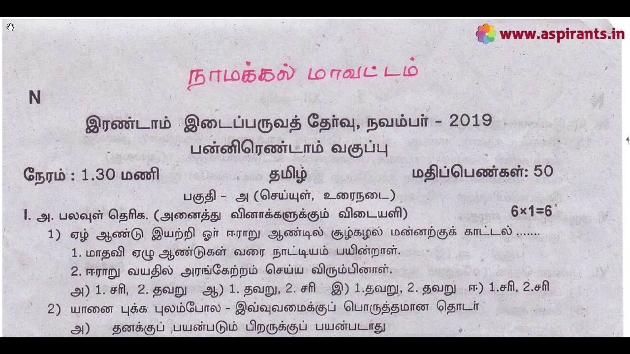12th Tamil 2nd MidTerm Question Paper 2019-20 | Namakkal District | Team Aspirants