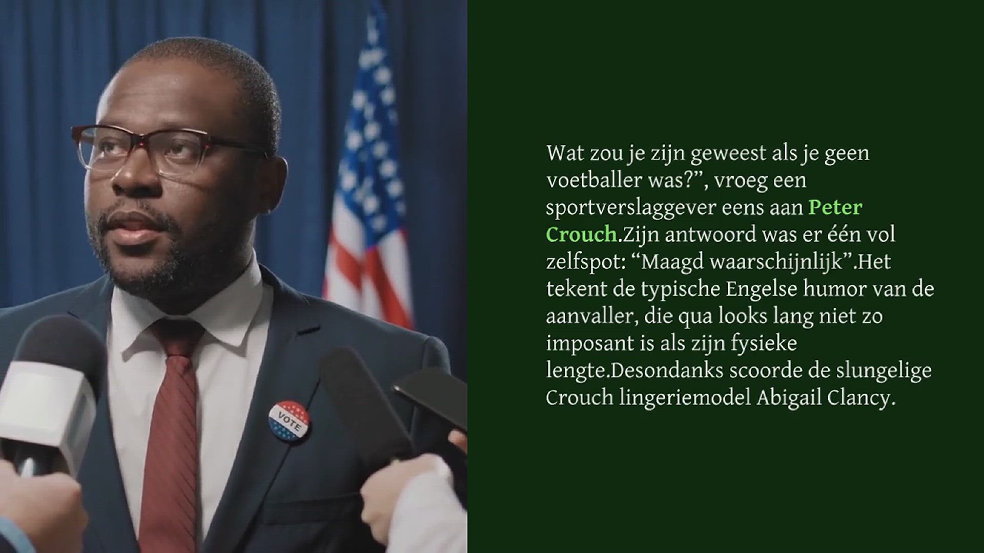 ,,Wat zou je zijn geweest als je geen voetballer was?”, vroeg een sportverslaggever eens aan Peter Crouch. Zijn antwoord was er één vol zelfspot: “Maagd waarschijnlijk”. Het tekent de typische Engelse humor van de aanvaller, die qua looks lang niet zo imposant is als zijn fysieke lengte. Desondanks scoorde de slungelige Crouch lingeriemodel Abigail Clancy.