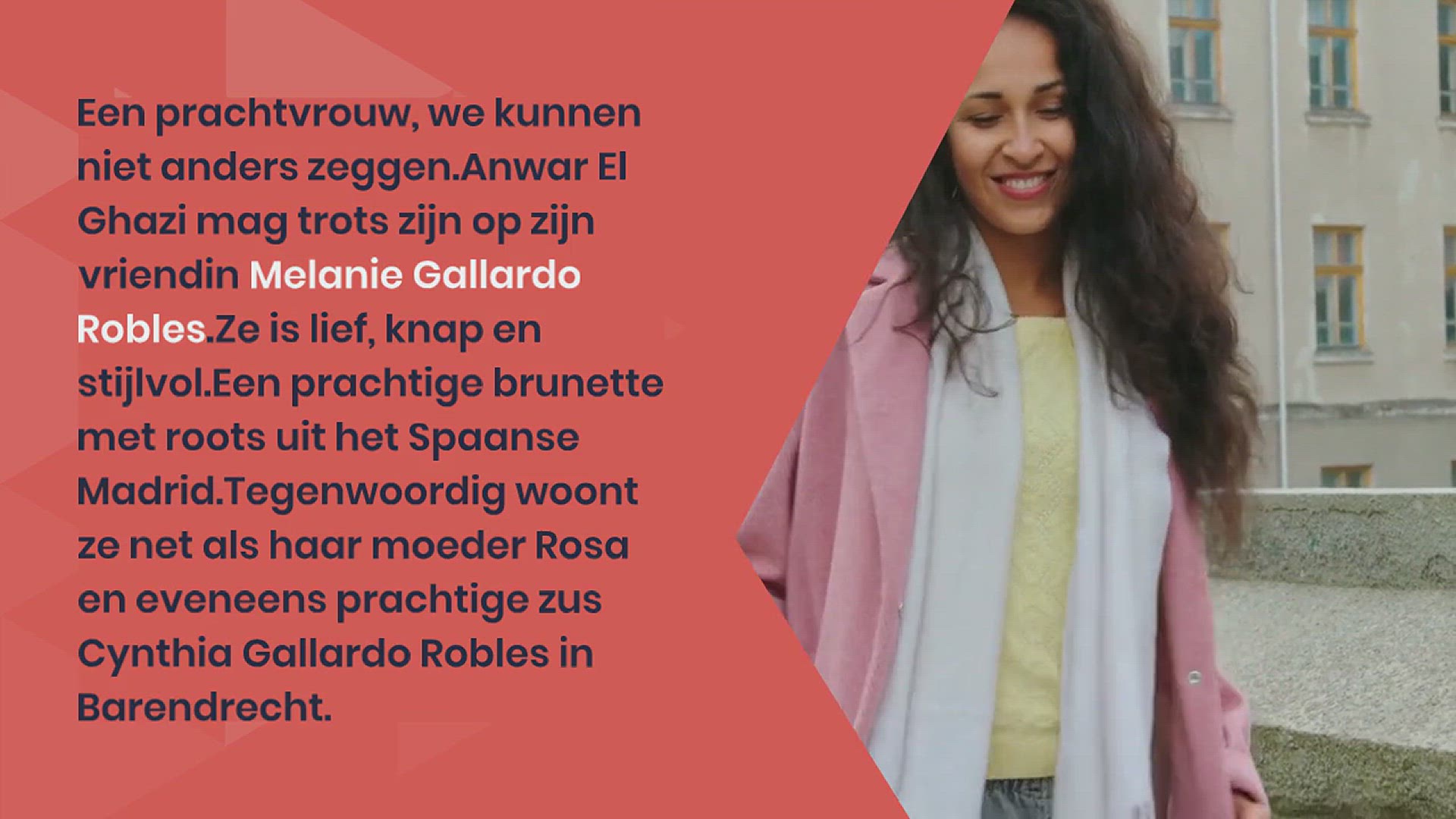 Een prachtvrouw, we kunnen niet anders zeggen. Anwar El Ghazi mag trots zijn op zijn vriendin Melanie Gallardo Robles. Ze is lief, knap en stijlvol. Een prachtige brunette met roots uit het Spaanse Madrid. Tegenwoordig woont ze net als haar moeder Rosa en eveneens prachtige zus Cynthia Gallardo Robles in Barendrecht.