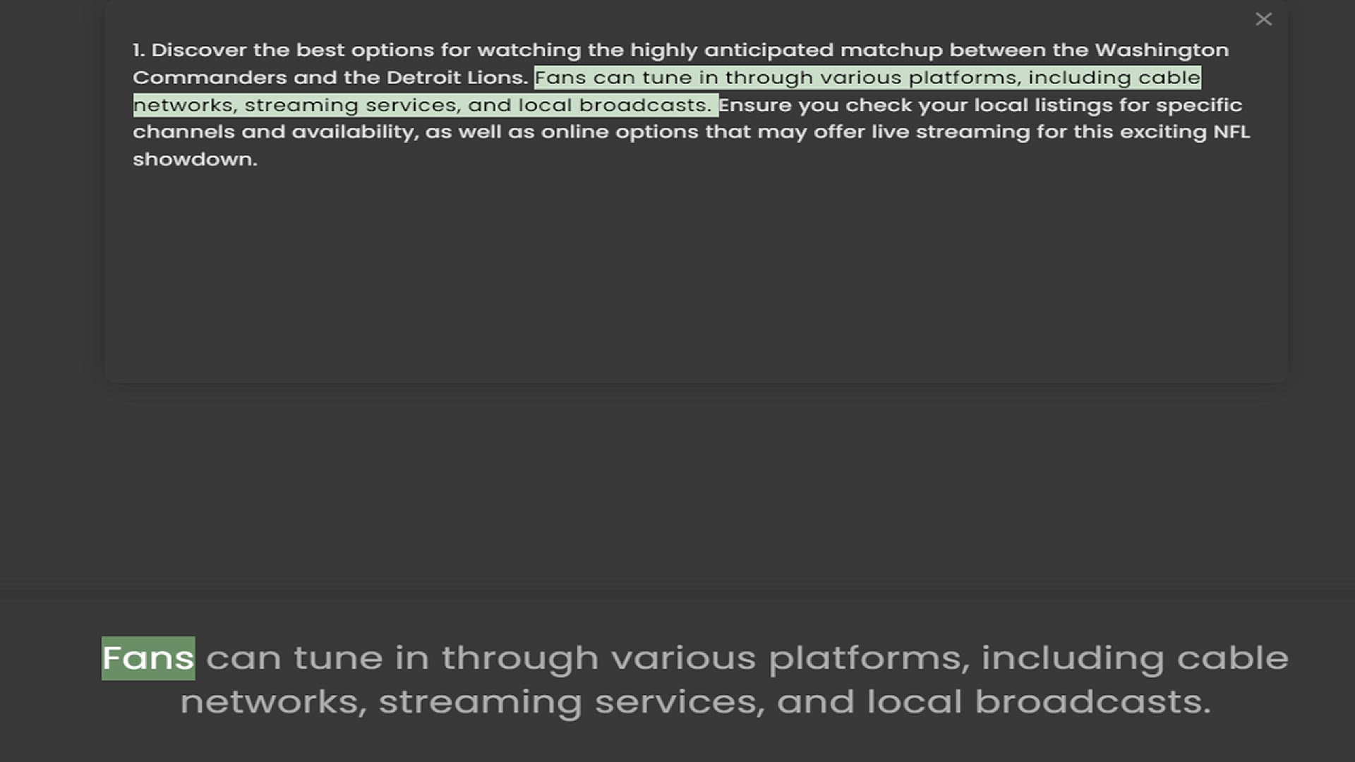 1. Discover the best options for watching the highly anticipated matchup between the Washington Commanders and the Detroit Lions. Fans can tune in through various platforms, including cable networks, streaming services, and local broadcas