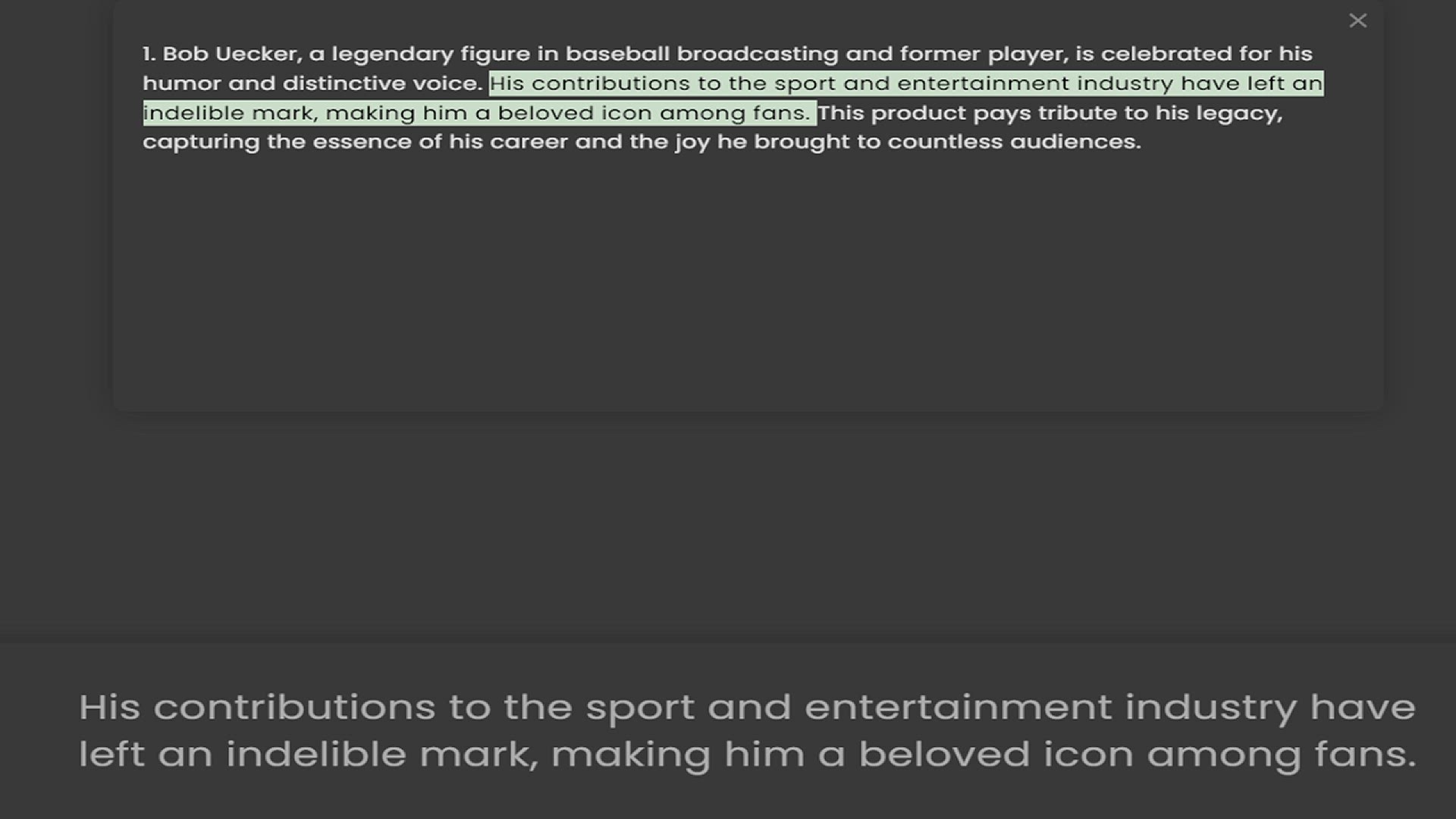 humor and distinctive voice. His contributions to the sport and entertainment industry have left an indelible mark, making him a beloved icon among fans. This product pays tribute to his legacy, capturing the e