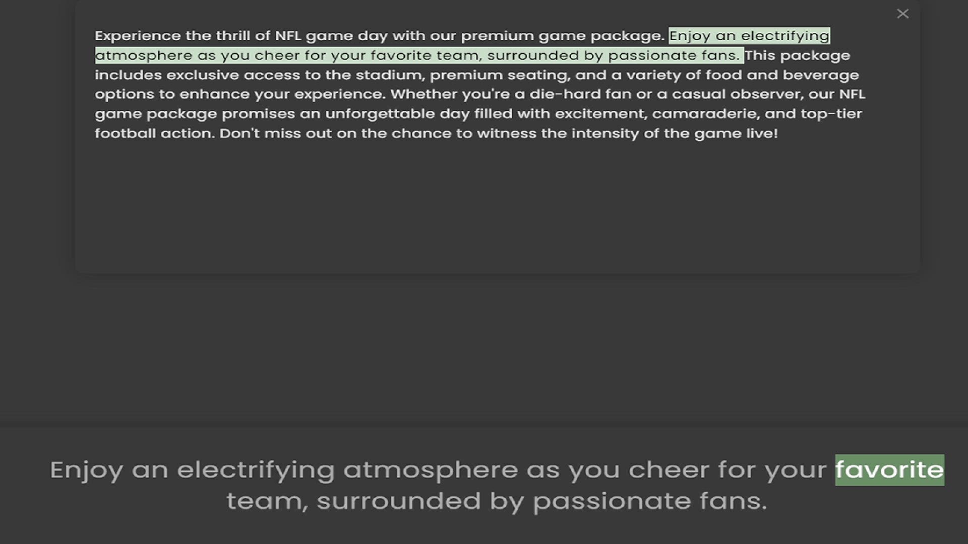 atmosphere as you cheer for your favorite team, surrounded by passionate fans. This package includes exclusive access to the stadium, premium seating, and a variety of food and beverage options to enhance your experience. Whether you'