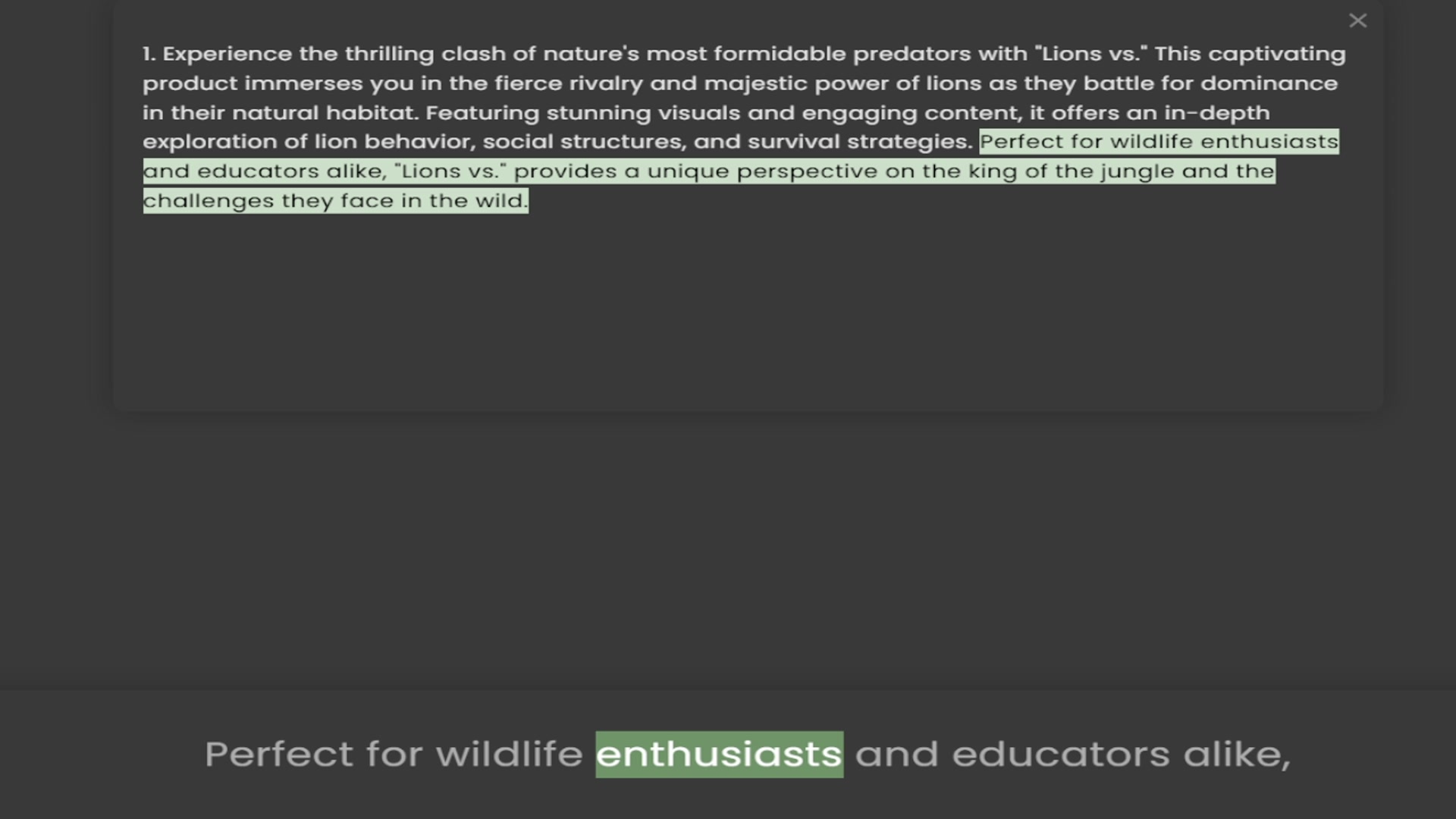 product immerses you in the fierce rivalry and majestic power of lions as they battle for dominance in their natural habitat. Featuring stunning visuals and engaging content, it offers an in-depth exploration of lion behavior, social stru