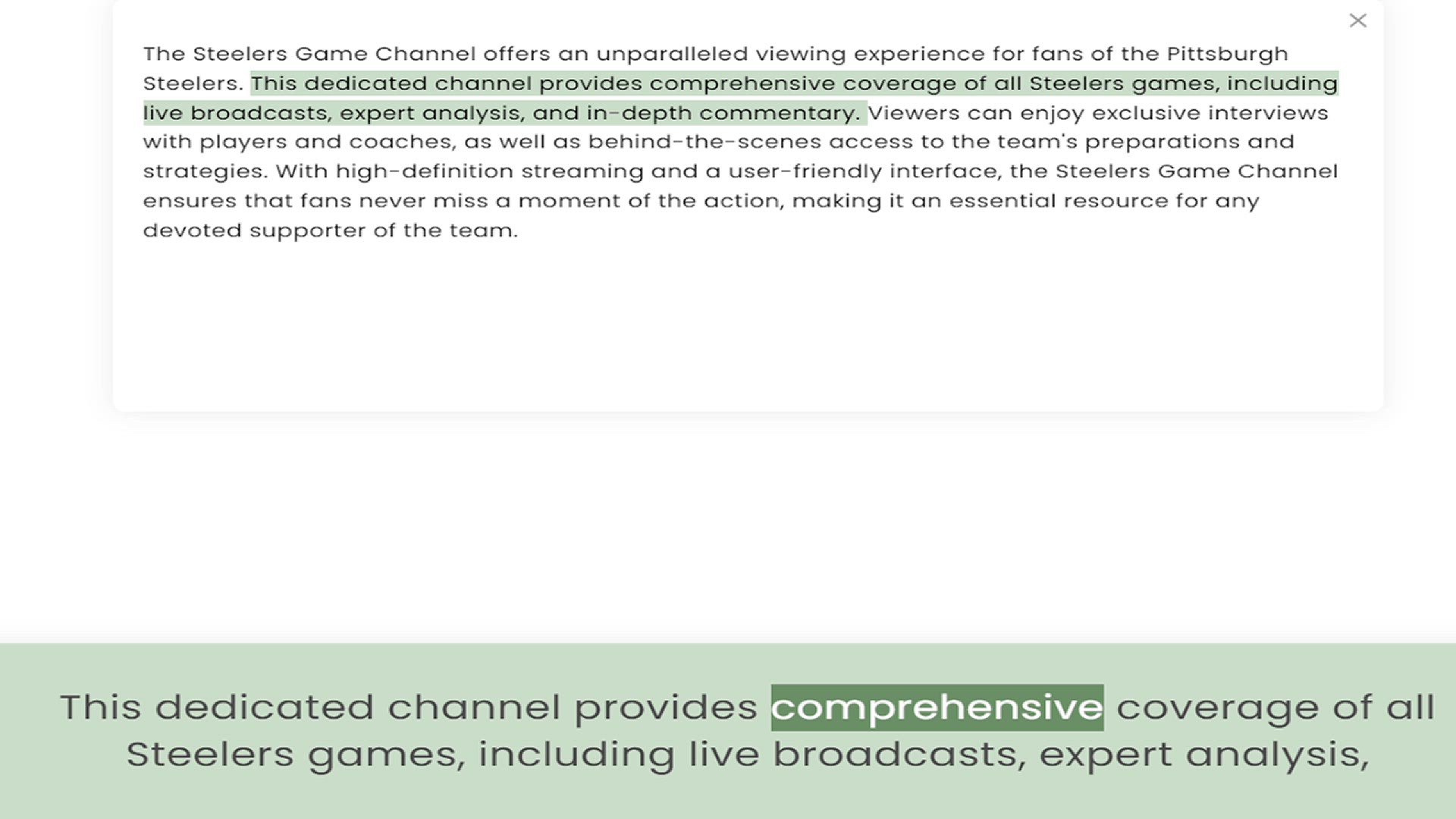 Steelers. This dedicated channel provides comprehensive coverage of all Steelers games, including live broadcasts, expert analysis, and in-depth commentary. Viewers can enjoy exclusive interviews with players and coaches, as well as behin