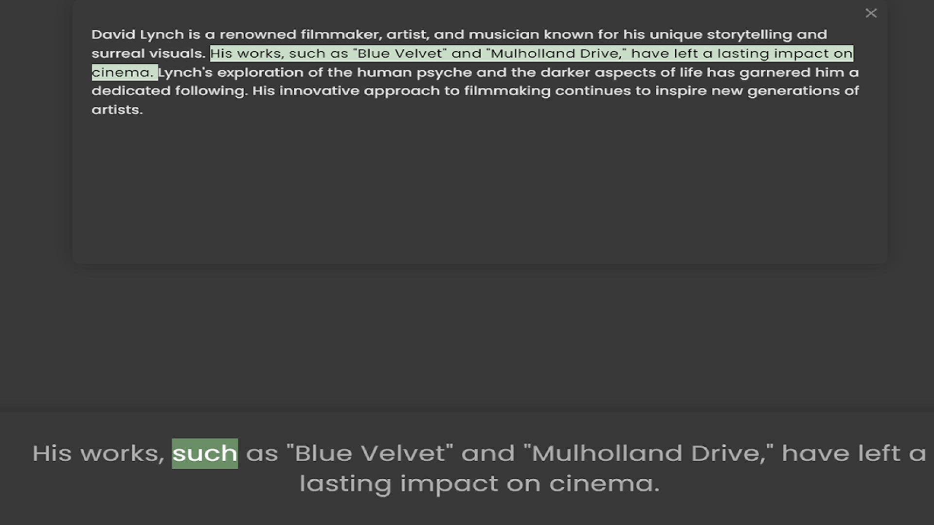 surreal visuals. His works, such as Blue Velvet and Mulholland Drive, have left a lasting impact on cinema. Lynch's exploration of the human psyche and the darker aspects of life has garnered him a dedicated following. His innovative appr