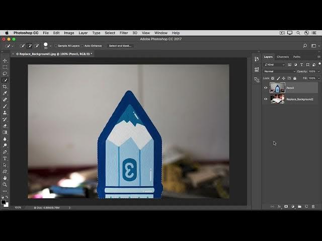 In the Tools panel, select the Quick Selection tool and use it to select all the areas in the original image you want to keep in the final output — everything except the background of the original image.