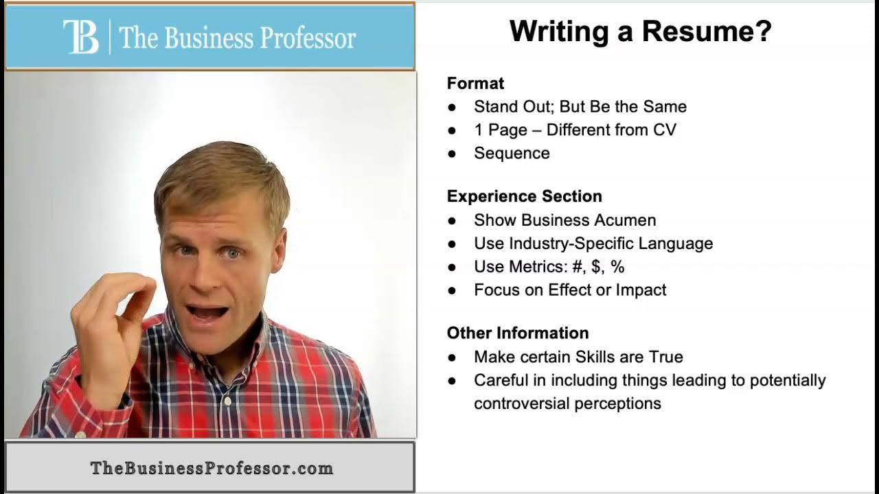 This video explains the primary objectives and considerations when writing a resume. https://thebusinessprofessor.com/en_US/profession/guidelines-for-writing-a-resume