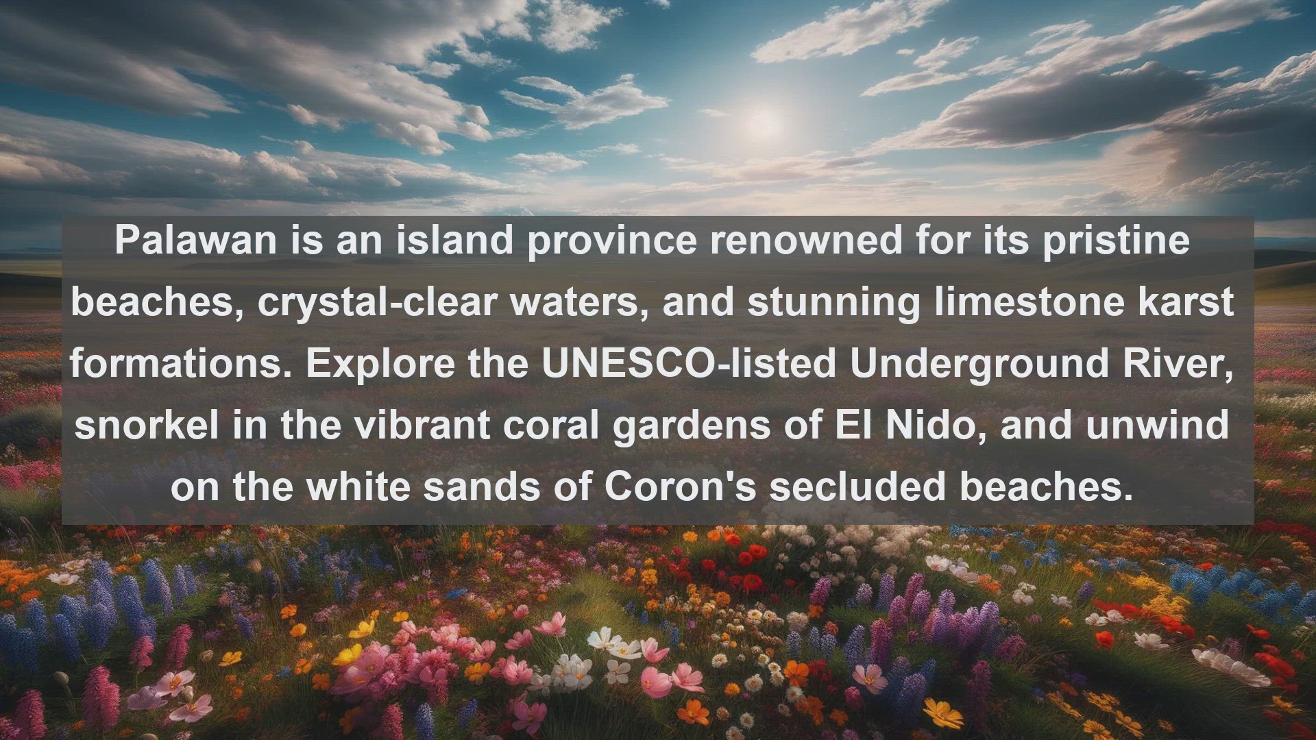 Embark on a visual journey through the Philippines' diverse landscapes, from pristine beaches and vibrant coral reefs to lush rice terraces and towering volcanoes. Join us as we uncover the natural wonders and cultural treasures that make the Philippines a paradise for travelers and adventurers.