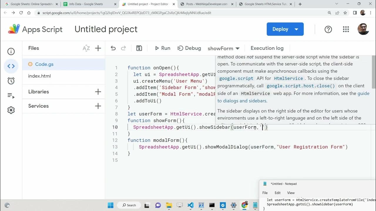 Google Sheets HTMLService Tutorial to Show Sidebar Modal Dialog Form in Google Sheets in App Script