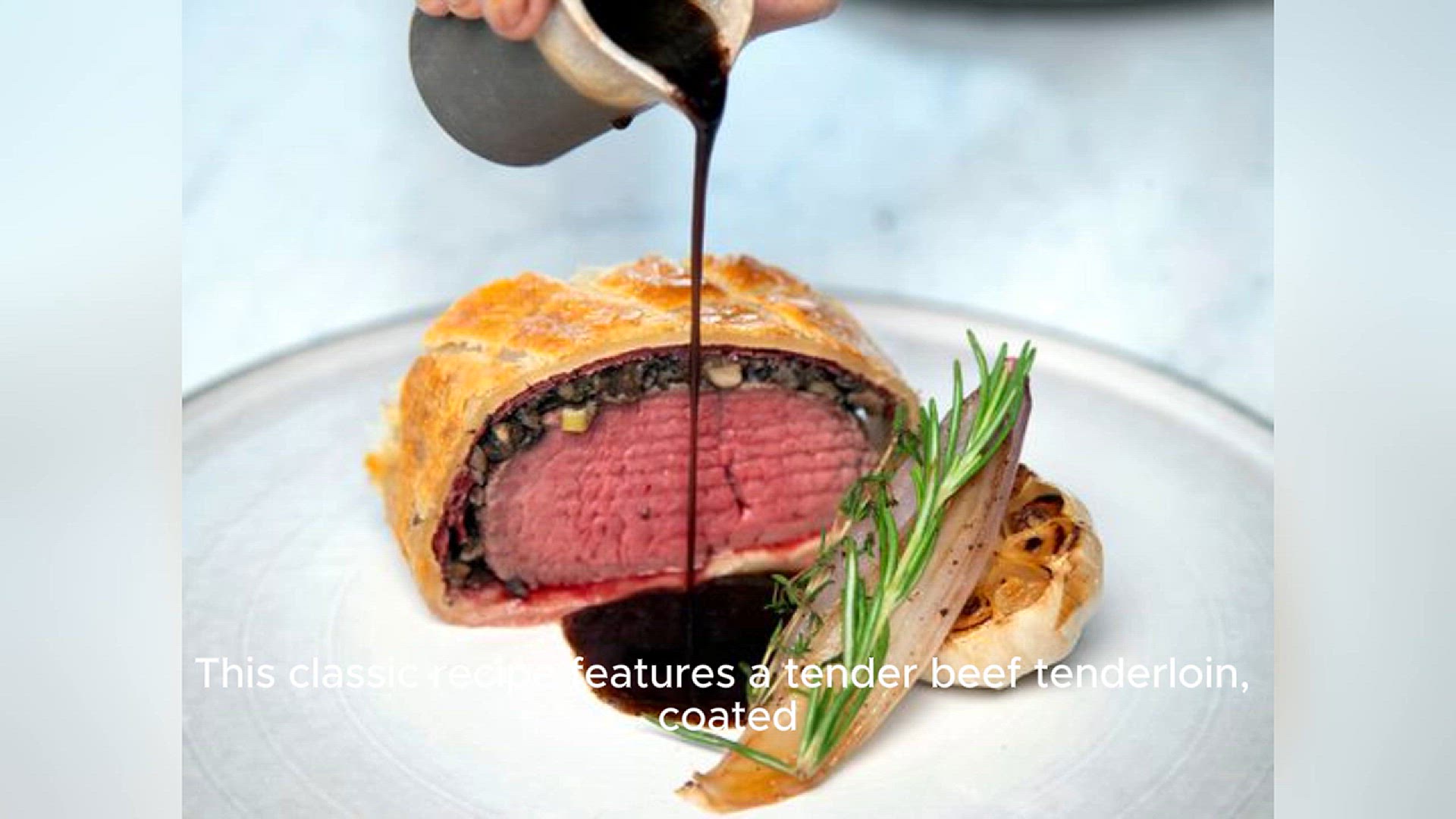 Beef Wellington: tender beef wrapped in prosciutto and puff pastry.