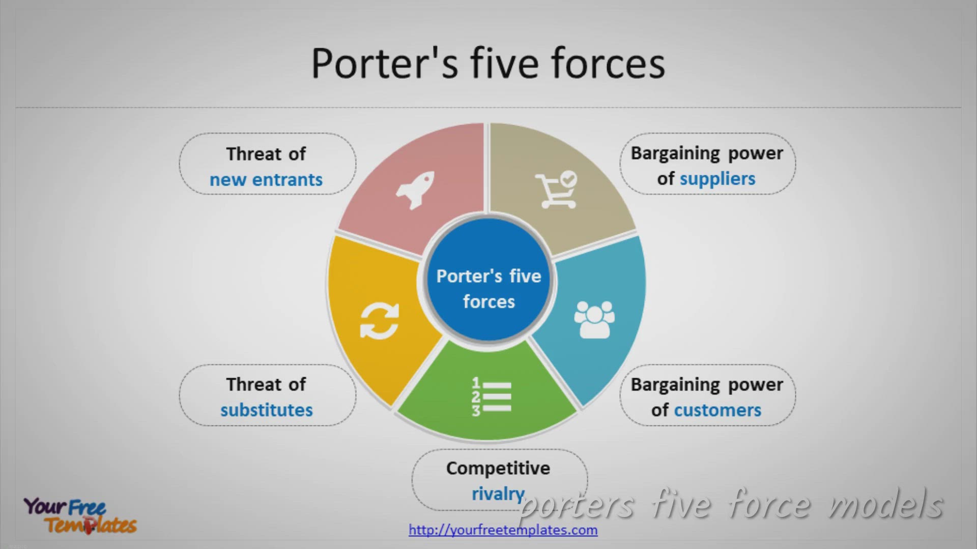 Free download Porter’s five forces template in PowerPoint format, you can enjoy the attractive Porter five forces templates and customized your templates.