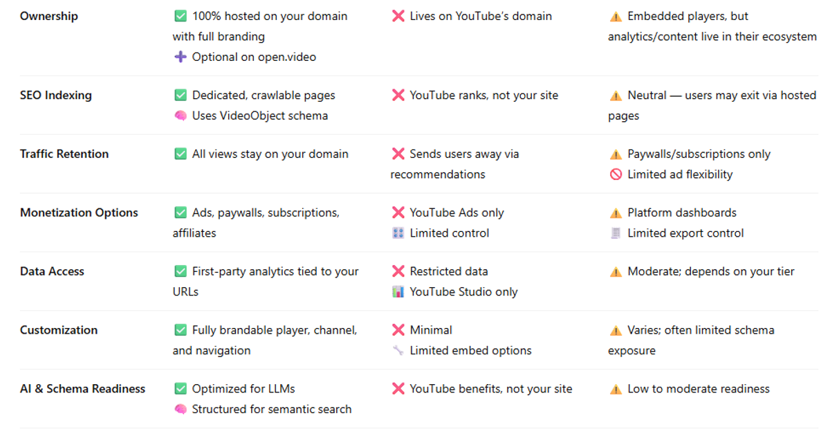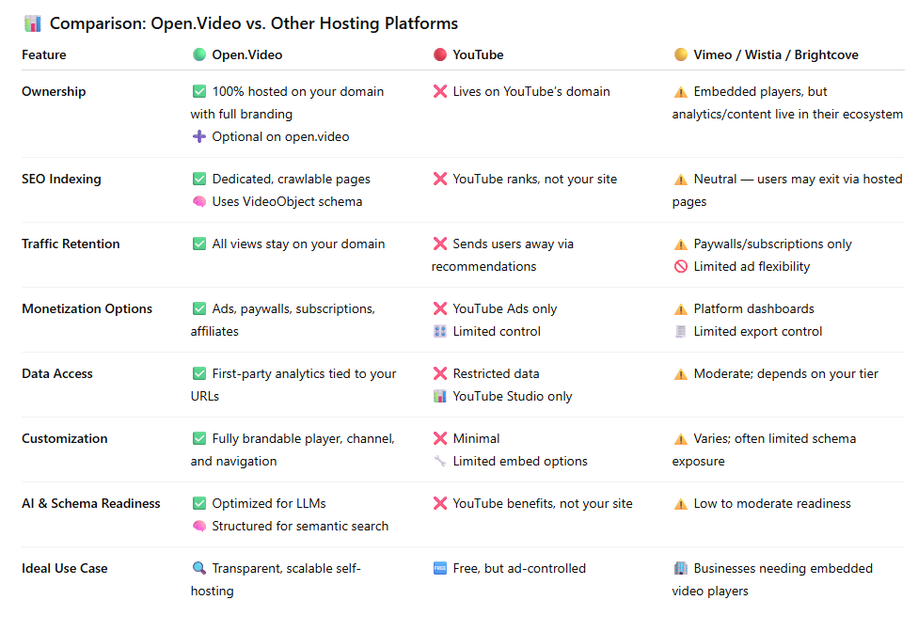 Open.Video was built to break out of both boxes. It’s a video engine for the open web—one that lives on your domain, matches your brand, and turns every video into a true SEO asset with flexible monetization. Below is a practical look at how it’s different and why that matters.